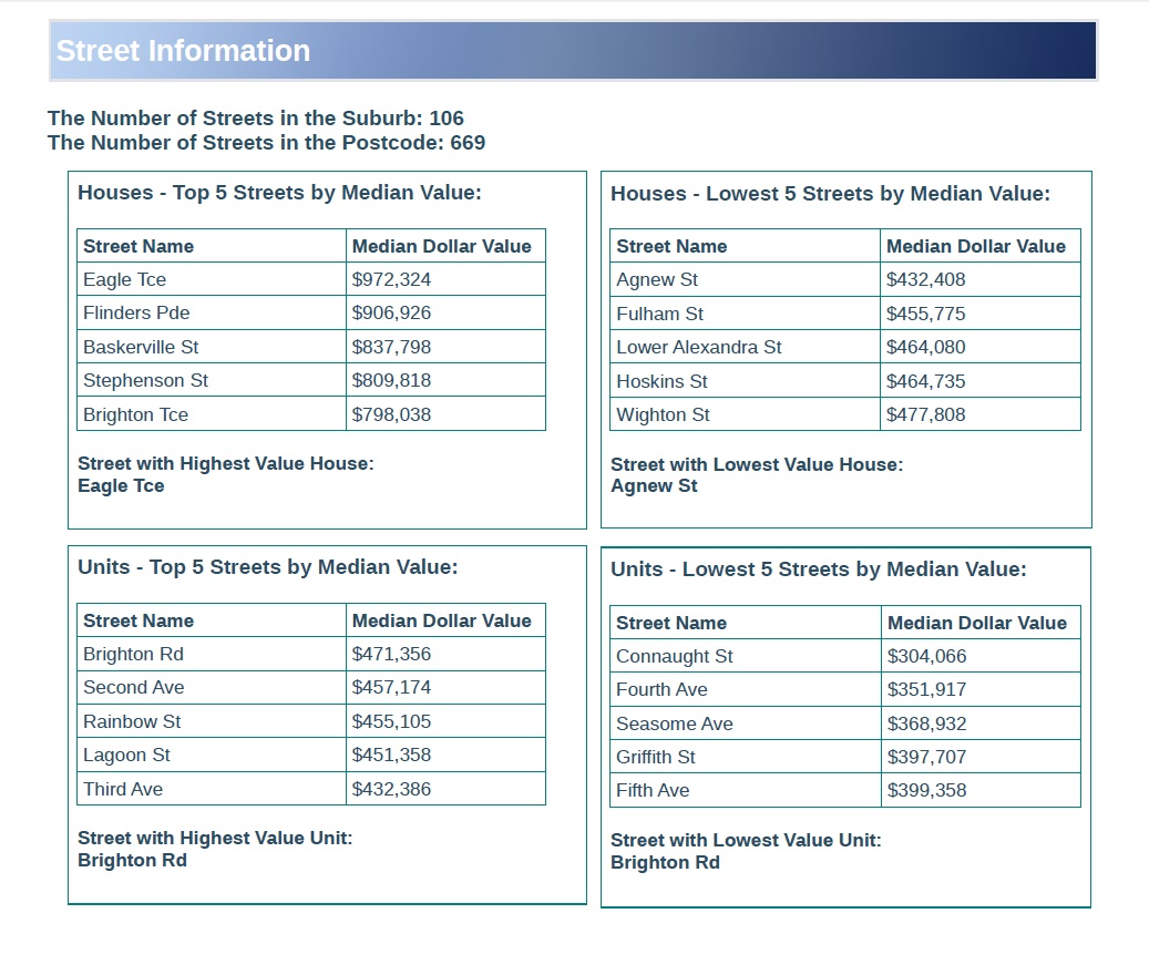 Popular streets for homeowners include Flinders Parade, Barton Street, Cliff Street, First Avenue, Rainbow Street and Southernden Street.